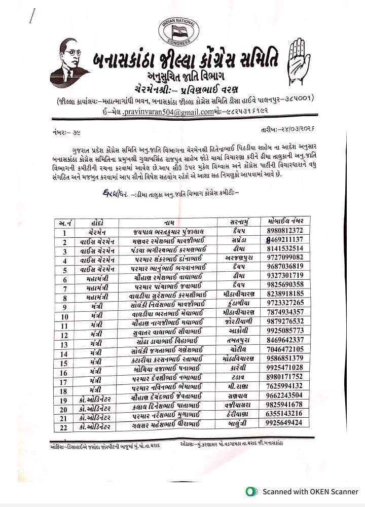 ઢીમા તાલુકા કોંગ્રેસ સમિતિમાં નવી નિમણૂંક